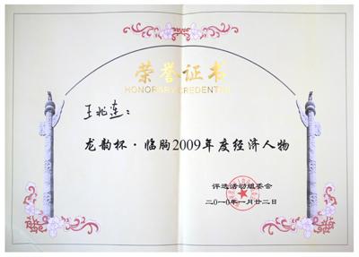 公司總經理兼董事長王兆連榮獲龍韻臨朐2009年度經濟人物