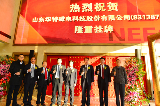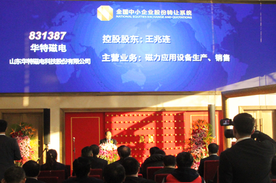 12月8日上午,山東華特磁電科技股份有限公司“新三板”掛牌儀式在全國(guó)中小企業(yè)股份轉(zhuǎn)讓有限責(zé)任公司隆重舉行。濰坊市金融工作辦公室副主任張新華、臨朐縣委常委、常務(wù)副縣長(zhǎng)衣利民、臨朐縣金融工作辦公室主任高凌利、臨朐縣城關(guān)街道黨工委書記沈明新、臨朐縣東城街道黨工委書記孫傳坤、山東華特磁電科技股份有限公司董事長(zhǎng)王兆連及公司股東和高管、臨朐縣相關(guān)企業(yè)負(fù)責(zé)人出席本次掛牌儀式。