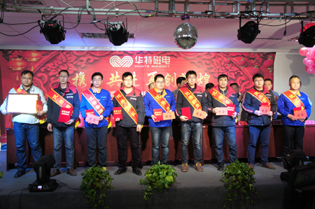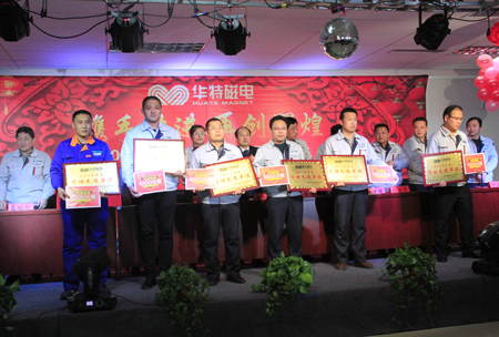 由公司董事長兼總裁王兆連作了《攜手共進 再創(chuàng)輝煌》工作報告,對2016年度工作進行了全面總結(jié)。2016年華特磁電公司更加發(fā)揚敢為人先的精神,優(yōu)化內(nèi)部管理能力,規(guī)劃創(chuàng)新發(fā)展戰(zhàn)略,公司上下一心,迎難而上,激流勇進,保持了良好的發(fā)展勢頭,在技術(shù)研發(fā)、生產(chǎn)制造、市場開拓方面有突破性進展。在過去的一年里,涌現(xiàn)出很多優(yōu)秀團隊和先進個人,他們秉持著對個人品格的堅守和對業(yè)務(wù)能力的追求,勤奮努力,力爭上游,是華特蓬勃向上的模范代表。提出了2017年的發(fā)展思路和工作計劃,明確了2017年的奮斗目標(biāo),令人鼓舞,振奮人心。