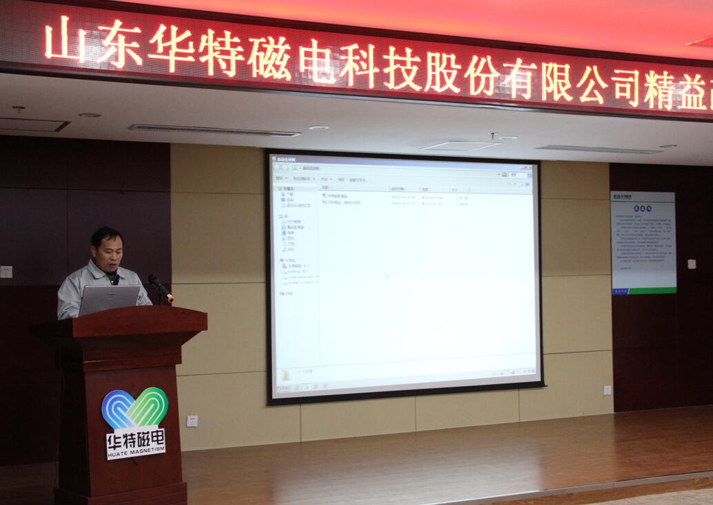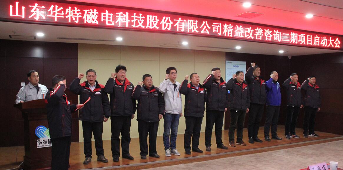 2018年1月14日,為進(jìn)一步提升山東華特磁電科技股份有限公司管理水平,增強(qiáng)公司競(jìng)爭(zhēng)力,實(shí)現(xiàn)企業(yè)高速發(fā)展,公司組織召開了精益生產(chǎn)二期項(xiàng)目的簽約、啟動(dòng)儀式和誓師大會(huì)。公司董事長(zhǎng)兼總裁王兆連、山東華制智能制造技術(shù)有限公司項(xiàng)目總監(jiān)王樹功、項(xiàng)目經(jīng)理王金泉等四位專家出席會(huì)議,公司常務(wù)副總裁劉風(fēng)亮、高級(jí)副總裁劉梅、副總裁兼精益辦主任王建波、各部門負(fù)責(zé)人以及主管級(jí)以上領(lǐng)導(dǎo)參加會(huì)議。