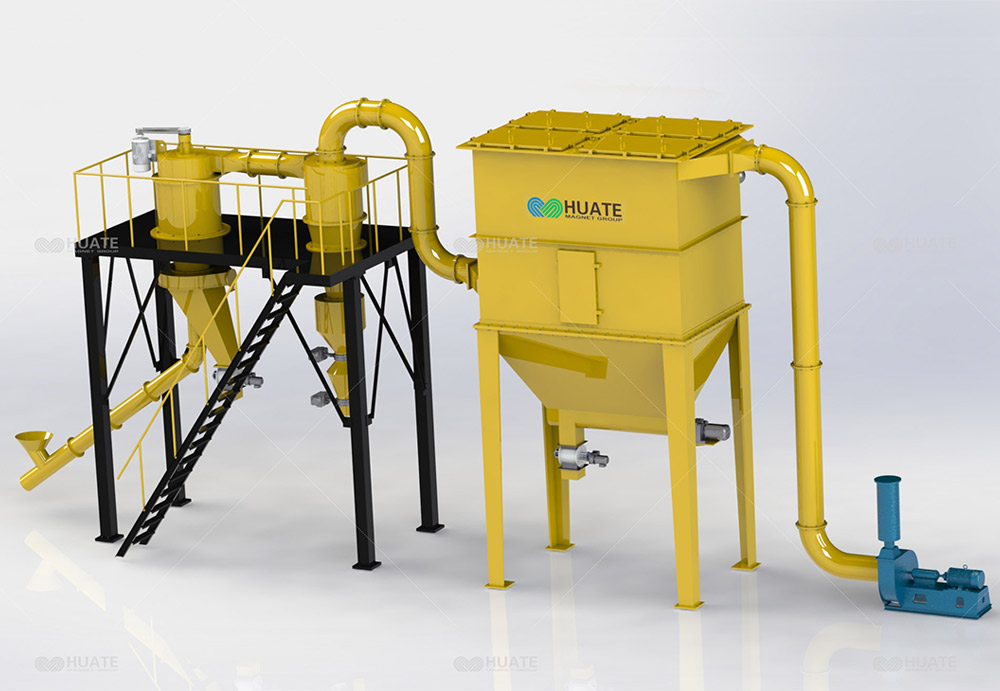 整套分級裝置由氣流分級機、旋風收集器、脈沖除塵器、高壓引風...